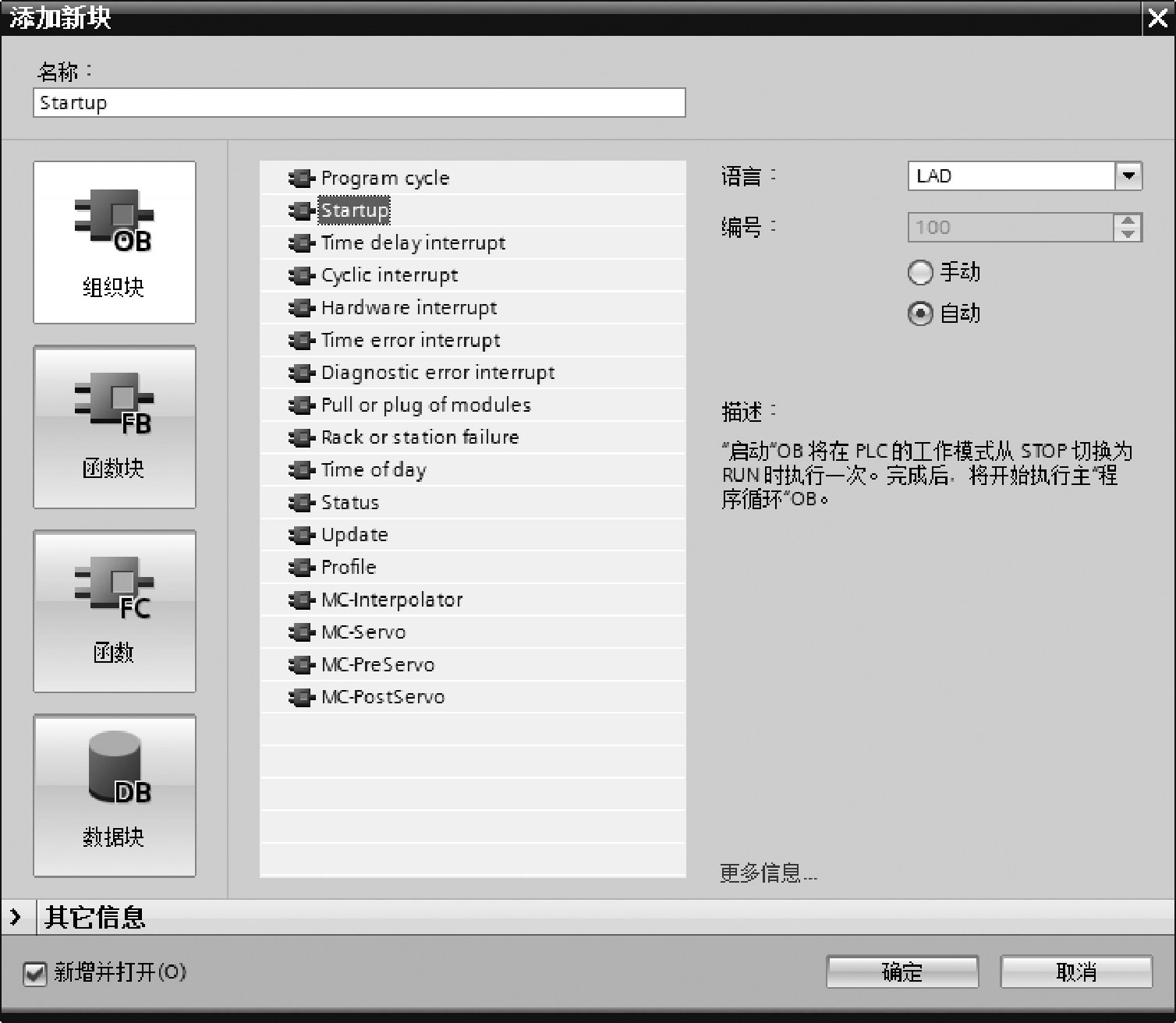“添加新块”界面如图2-74所示,在如图2-75所示中选择“组织块”中的“Startup”,即OB100后,就可以在正常的OB1中进行梯形图的编程,将“0”移动到状态值变量MW0中,如图2-76所示。