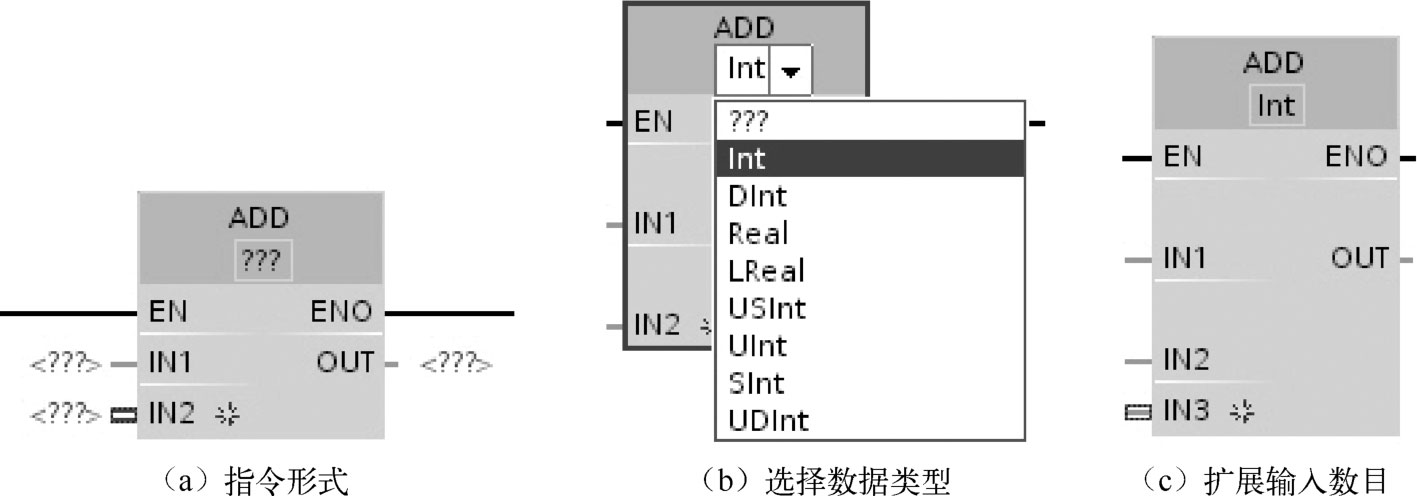 扩展输入数目,如图2-50(c)所示,按升序对扩展的输入进行编号,当执行加(ADD)指令时,将所有输入参数的值相加,相加结果存储在输出OUT中。