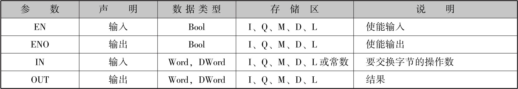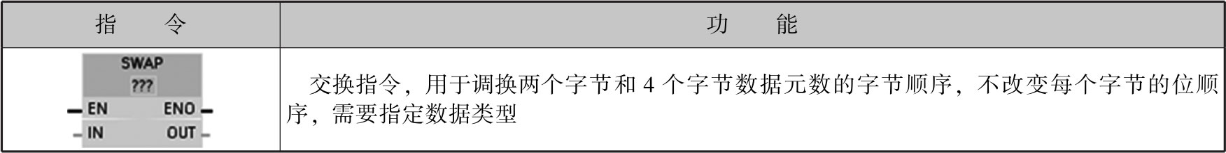 使用SWAP指令可以更改输入IN的值中字节的顺序,在输出OUT中查询结果。图2-68为SWAP指令的执行操作。表2-28为SWAP指令的参数。