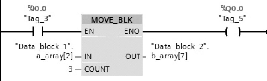图2-63为MOVE_BLK(块移动)指令的工作原理,就是利用MOVE_BLK(块移动)指令,将DB1中的a_array[2]到a_array[4]共3个数据元素复制到DB2中以b_array[7]开始的3个地址中。