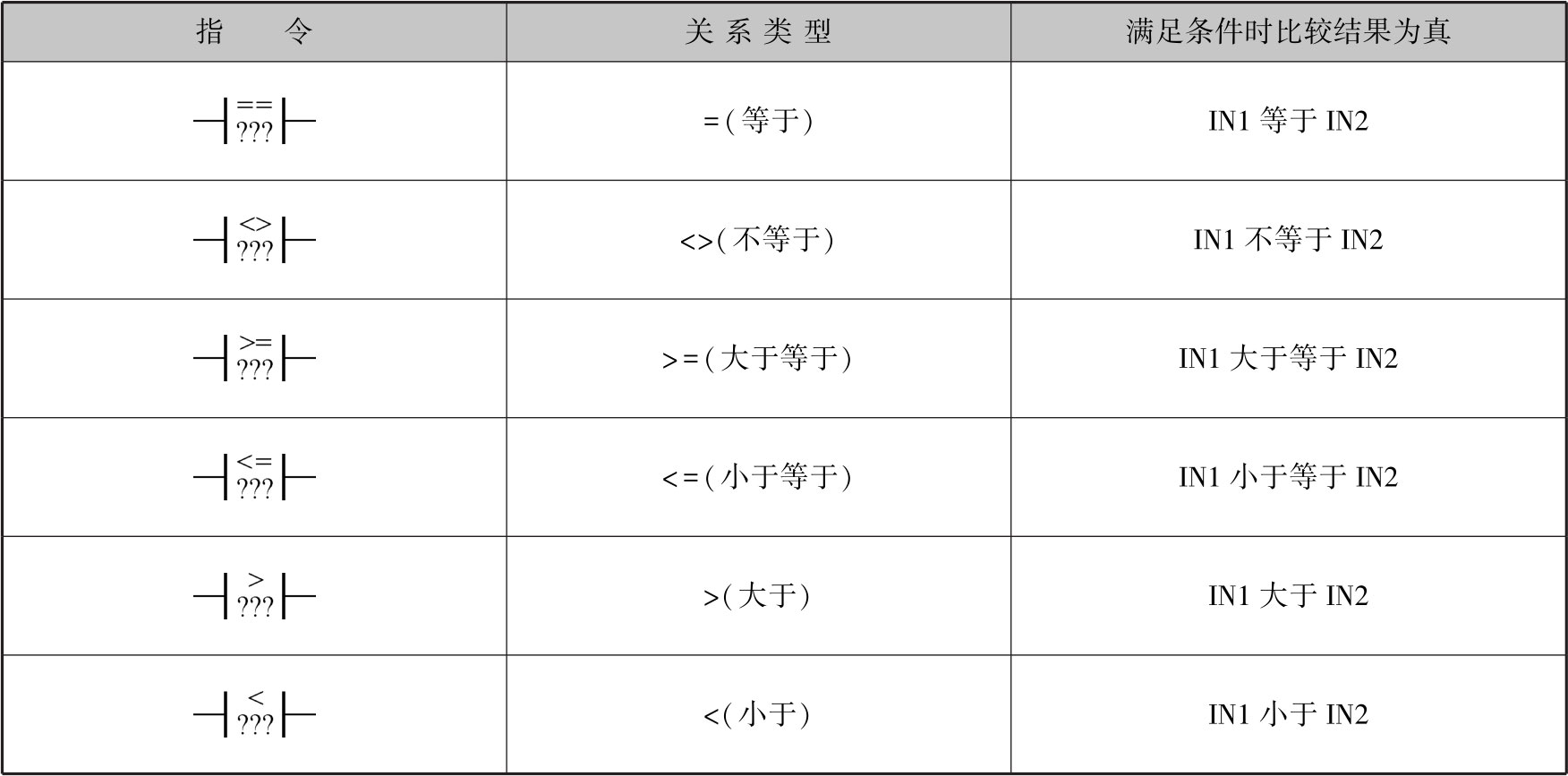 表2-20为等于、不等于、大于等于、小于等于、大于、小于等6种比较指令触点的满足条件。