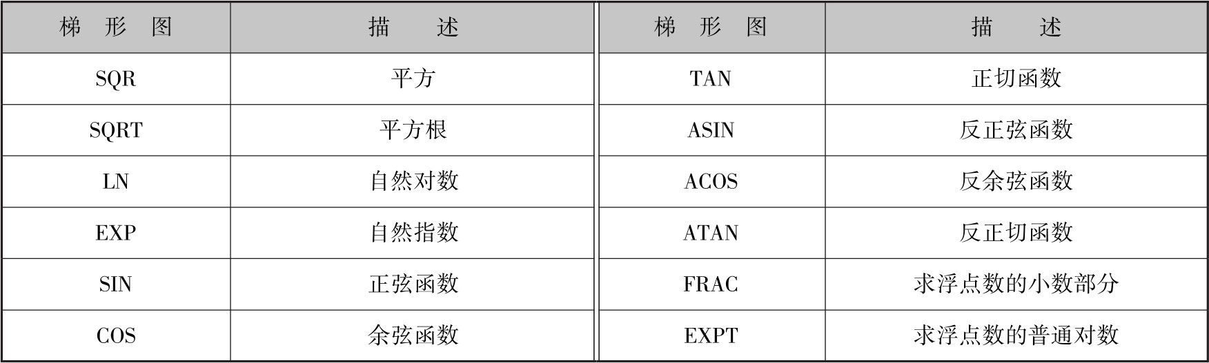 浮点数函数运算的梯形图及对应的描述见表2-24。需要注意的是,三角函数指令和反三角函数指令的角度均为以弧度为单位的浮点数。