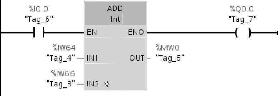 图2-51举例说明了加(ADD)指令的工作原理:如果操作数%I0.0的信号状态为“1”,则执行加(ADD)指令,将操作数%IW64的值与%IW66的值相加,相加结果存储在操作数%MW0中。如果加(ADD)指令执行成功,则使能输出ENO的信号状态为“1”,同时置位输出%Q0.0。