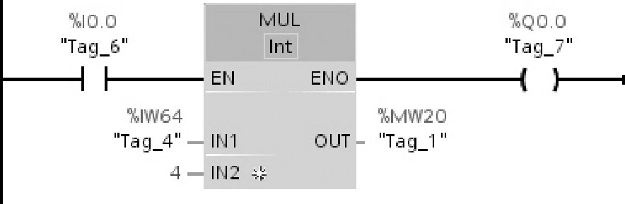 图2-55举例说明了乘(MUL)指令的工作原理:如果操作数%I0.0的信号状态为“1”,则执行乘(MUL)指令,将操作数%IW64的值乘以操作数IN2的常数值“4”,相乘结果存储在操作数%MW20中。如果成功执行乘(MUL)指令,则输出ENO的信号状态为“1”,并将置位输出%Q0.0。
