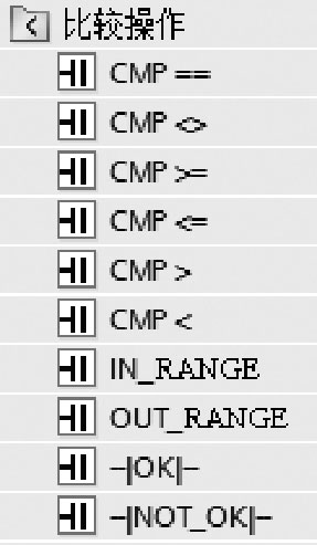 如图2-48所示,西门子S7-1200 PLC有10个比较操作,用来比较数据类型相同的两个操作数的大小。操作数可以是I/Q/M/L/D存储区中的变量或常量。当满足比较关系式给出的条件时,等效触点就会接通。