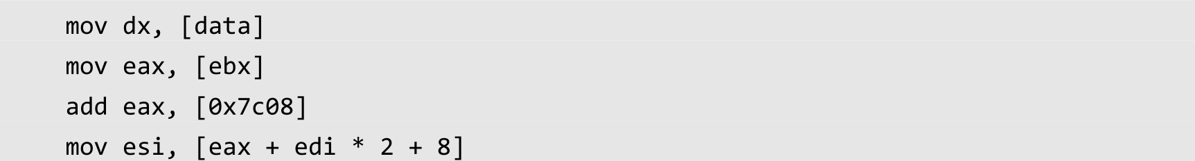 以上,在第一条指令中,有效地址来自标号data,是标号代表的汇编地址;在第二条指令中,有效地址来自寄存器EBX,是EBX的内容;在第三条指令中,有效地址是一个直接给出的数值0x7c08;在第四条指令中,有效地址来自寄存器EAX的内容加上寄存器EDI的内容乘以2的值,再加3。