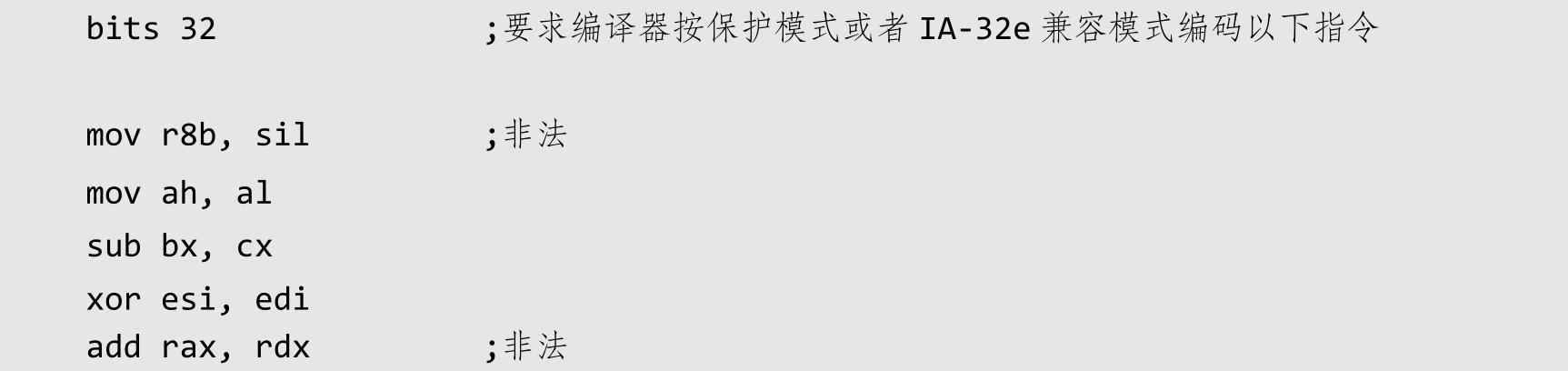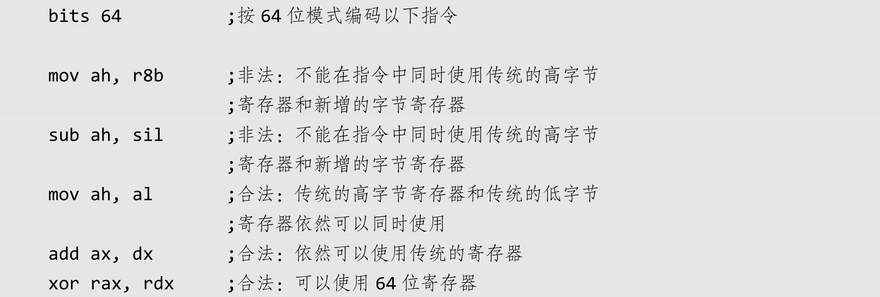 在64位模式下,对字节长度的寄存器有一些使用上的限制,寄存器的访问限制起源于64位模式下的指令编码规则。比如,不能在指令中同时使用传统的高字节寄存器和新增的字节寄存器。所以前两条指令是非法的。
