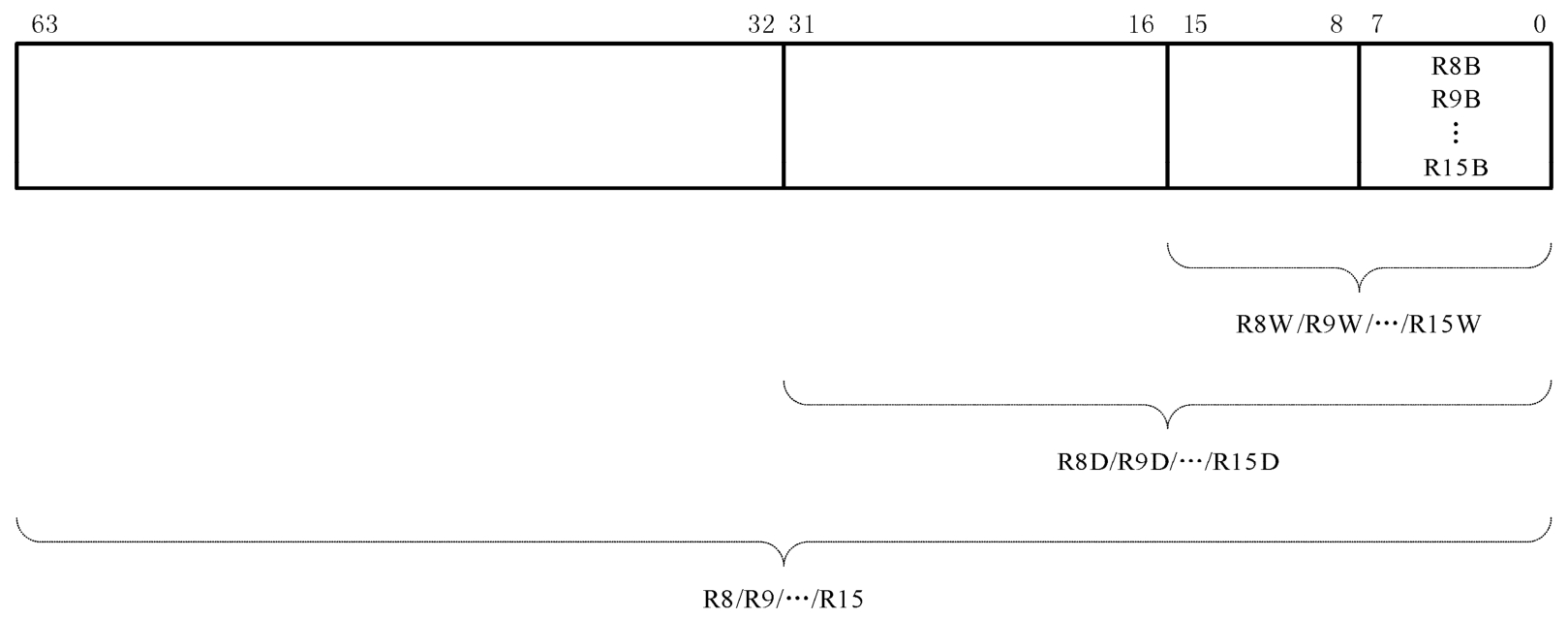这些寄存器的低16位可以当成长度为字的寄存器来用,分别叫作R9W、R10W、R11W、R12W、R13W、R14W和R15W;