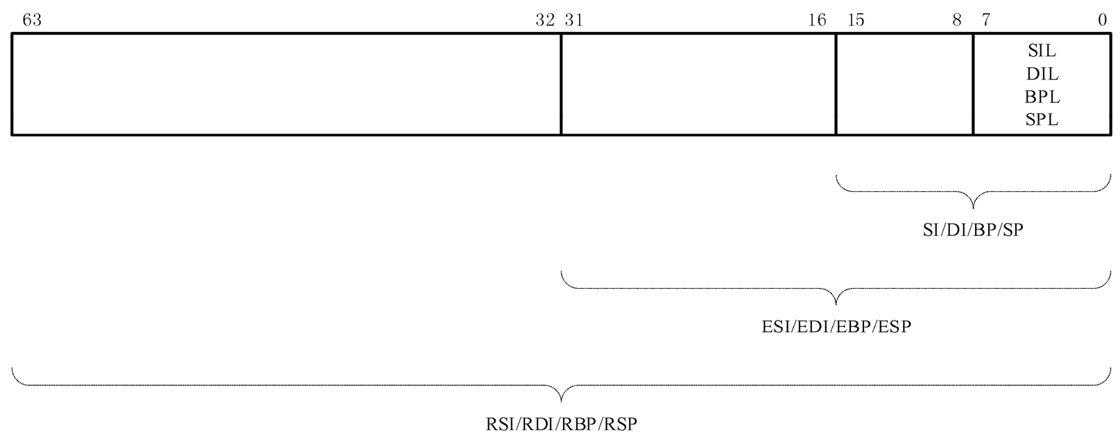 32位的ESP扩展到64位的RSP,比特编号从0到63。其中,低32位还是原先的ESP,低16位还是原先的SP。在以前的32位处理器上,低8位不可用,但是在64位处理器上是可用的,但也只能在64位模式下使用,叫作SPL。