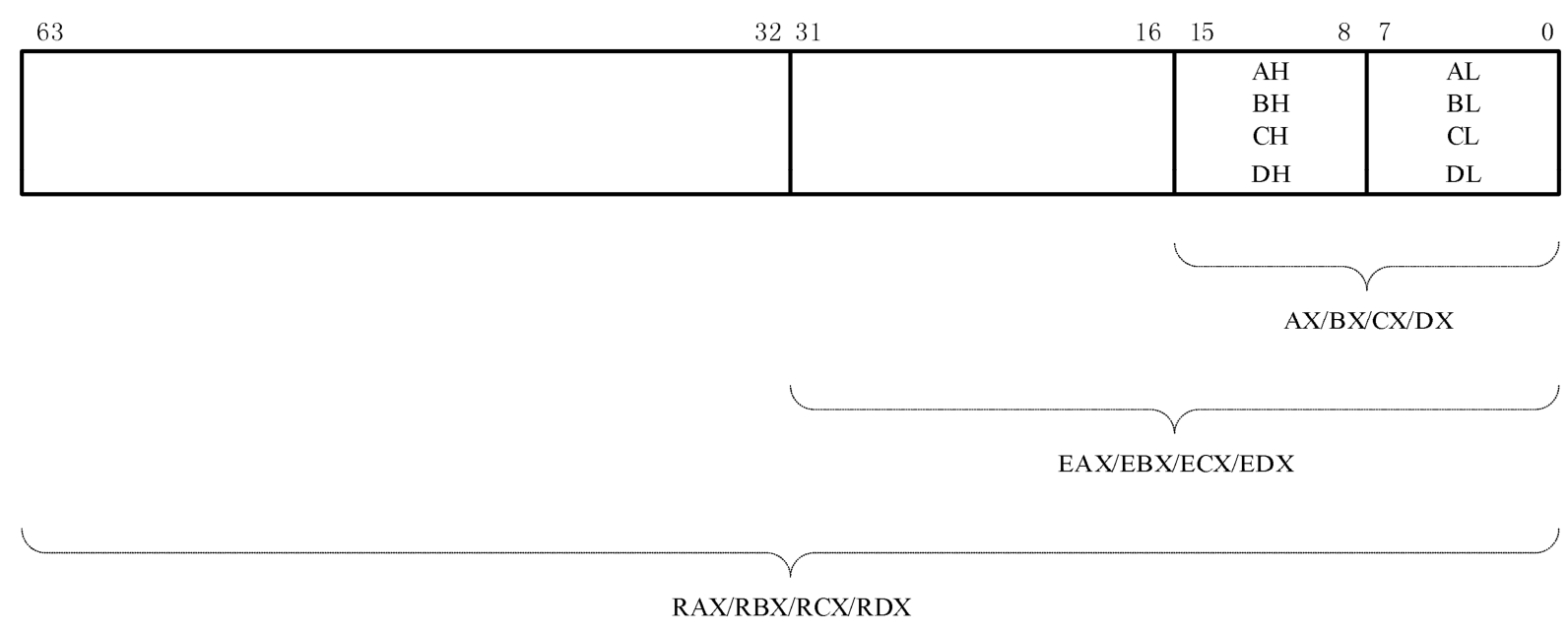 32位的EDX扩展到64位的RDX,比特编号从0到63。其中,低32位还是原先的EDX,低16位还是原先的DX,原先的DH和DL依然可用。