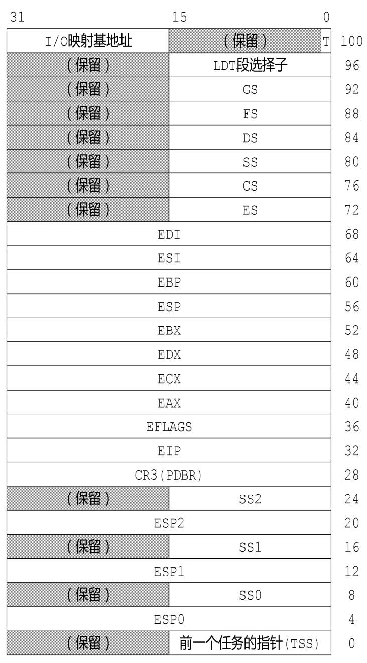 如图2-34所示,这是传统模式下的任务状态段TSS,当中断和异常发生时,如果特权级发生了改变,则从当前任务的TSS中选择一个适当的栈段选择子与栈指针,TSS中的其他内容用于硬件任务切换。