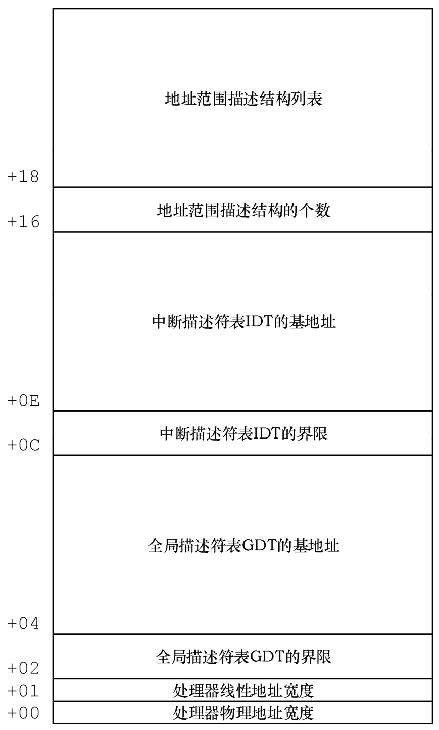 访问系统数据区是临时性的动作,所以要用第151行的push指令保存DS以便将来恢复。接着,第152~153行,将DS切换到系统数据区。这是在实地址模式下,要将系统数据区的物理地址右移4位,得到逻辑段地址。如图3-5所示,这是系统数据区的布局,最低2字节分别是处理器的物理地址宽度和线性地址宽度。第154行,将AX中的地址数据保存到系统数据区内偏移为0的字内;第155行,恢复段寄存器DS的原始内容。