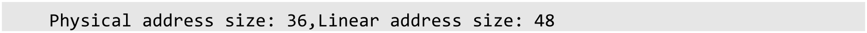 要获取物理地址和虚拟地址尺寸,可以用功能号0x8000 0008调用cpuid指令。指令执行后,EAX的位0到位7是物理地址尺寸;位8到位15是虚拟地址尺寸,或者叫线性地址尺寸。