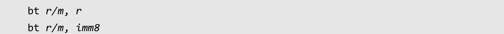 位串可以在寄存器里,也可以用内存地址来指定,所以目的操作数部分用 r/m 表示;源操作数用来指定要测试的比特,可以用寄存器来指定(用 r 表示),也可以用8位立即数来指定(用 imm8 表示)。