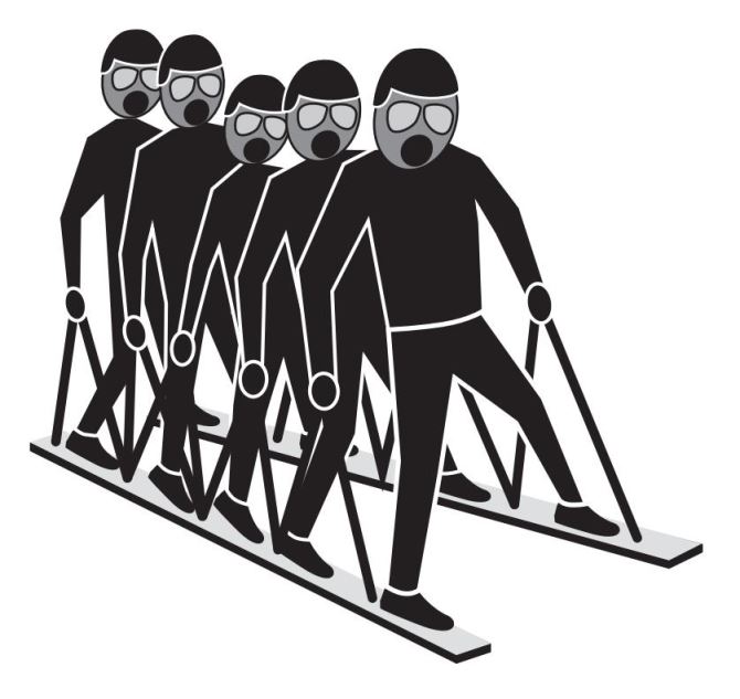 所有人戴着防毒面具站在木板上,队长在最前面喊“左”,士兵们就一起抬左脚并把左侧木板向前拖动一点儿;队长喊“右”,他们就一起抬右脚并拖动右侧木板向前走。然而,10分钟后,问题出现了,有的人抬起木板的速度过快,还有的人步子迈得太大,再加上所有人都戴着防毒面具,根本听不清队长的指令。他们已经走了一段路,来不及回头。可是,如果以这个速度前进,可能要花好几个小时才能穿过大坑。士兵们开始大叫着互相示意停下脚步。