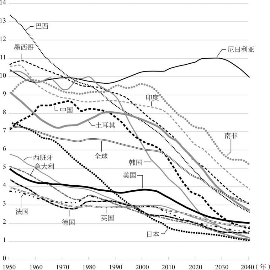 就上述任一情景而言,问题的根源都在于工作年龄人口和退休年龄人口的比率,该比率的下降会对我们的社会构成根本性挑战。从图2.1中,我们可以看到情况的糟糕程度。1950年,就全球范围来讲,1名60岁及以上的人对应7.2名年龄在15~59岁的人;2022年,这个数字下降到4.4。中国从7.1降至3.5,美国从5.0降至2.5,韩国和日本的下降速度更为可怕,前者从10.3降至2.5,后者从7.5降至1.5。考虑到生育率的下降和预期寿命的延长,这些比率在接下来的几十年里还将继续下降,进而迫使就业人员缴纳更多的税——他们不仅要为养老金埋单,还要为60岁及以上人口的医疗保健服务埋单。到2040年,在日本和韩国,工作年龄人口和60岁及以上年龄人口的平均比率将会降到略大于1的水平。对一个社会来说,如此低的比率绝对是不可持续的,除非所有的重物搬运工作都由机器人来完成。在美国,该比率将会降到2。这两个比率都将无法兑现国家对医疗保健服务和养老金的承诺,原因很简单,因为履诺的前提条件是一名60岁及以上的老年人必须对应三四位就业人员。这些数字清楚地表明,每代之间的权衡是复杂的、难以驾驭的,尤其是当年轻就业人口要为大部分账单埋单时。