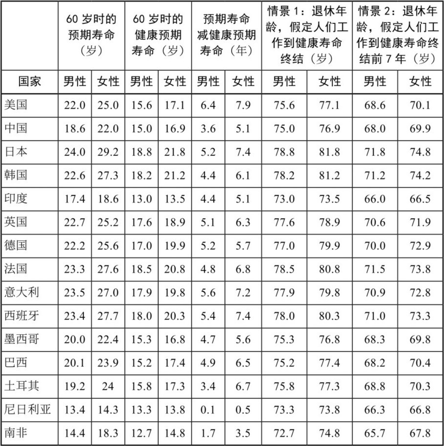 表2.1 2019年60岁人口的平均预期寿命、平均健康预期寿命和退休情景分析