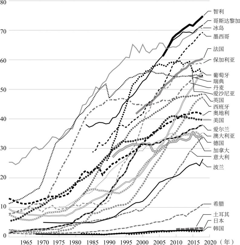 从文化角度讲,我们对亲密关系和婚姻的看法已经发生转变。除此之外,还有一个事实,即我们所处的这个社会已经不再是一个严格遵循人生顺序模式且以传统的核心家庭为主体的社会。无论是富裕国家还是贫穷国家,单亲家庭的数量都呈上升趋势,而这背后的原因也很明显——双方分居、离婚或从未在一起生活过。我们首先来看一下非婚生育比例,如图3.1所示。非婚生子女会造成单亲家庭,但也并非都是如此。在欧盟,2018年非婚生育比例为41.3%,高于美国的39.6%。即便是爱尔兰,也达到了37.9%,比例接近于美国。该比例特别高的国家包括西班牙(47.3%)、英国(48.2%)、爱沙尼亚(54.1%)、丹麦(54.2%)、瑞典(54.5%)、葡萄牙(55.9%)、保加利亚(58.5%)、法国(60.4%)和冰岛(70.5%)。由此可见,无论宗教背景、地理纬度和发展水平如何,非婚生子女现在更常见于富裕国家。但拉丁美洲属于例外,尽管当地经济发展水平相对较低,但非婚生婴儿的比例非常高:墨西哥为69.3%,哥斯达黎加为71.8%,智利更是达到了惊人的73.7%。需要特别指出的是,1960年,只有少数西欧国家的非婚生育比例超过10%(冰岛、奥地利和瑞典),其余大多数国家都低于5%。当时,美国非婚生育比例为5.3%,加拿大为4.3%。