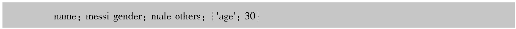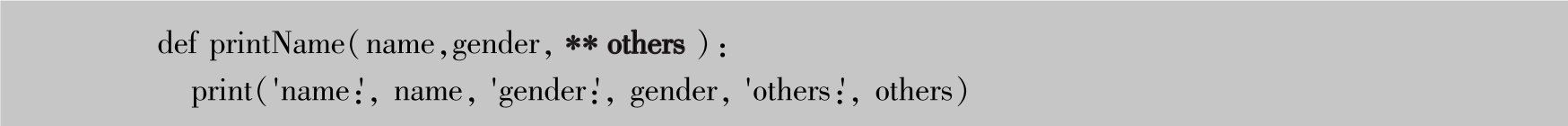 假设需要调用printName函数实现用户的信息管理功能,则除了name和性别,还想继续添加年龄信息怎么办呢?此时可以借助 关键字参数 。关键字参数是在参数名称前添加两个星号,如**par。