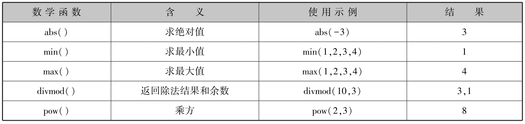 Python提供了大量定义好的函数,即内置(built-in)函数。内置函数随着Python解释器的运行而创建,Python程序可以随意调用,不需要定义。Python中有以下比较常见的内置函数。