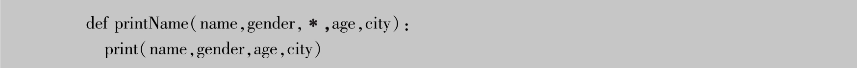对于printName函数,如果不允许用户随意添加新的参数(身高、体重等),只允许添加年龄、城市,那么可以使用 命名关键字参数 来实现。命名关键字参数需要使用特殊分隔符(*),后面紧跟着的参数即是命名关键字参数。修改printName函数为