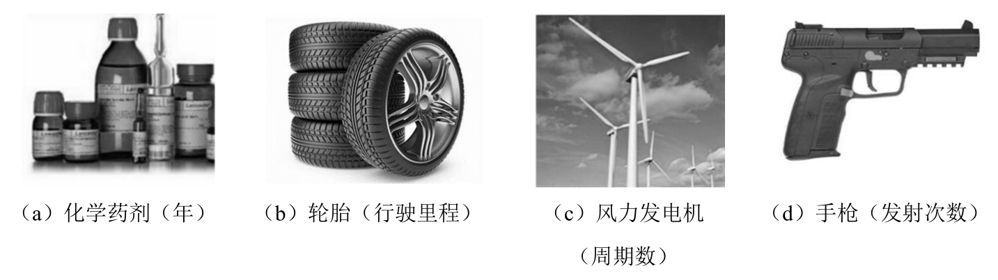 以图2.1中的四类产品为例,其用于定义寿命的时间单位分别为年、千米数、周期数、发射次数。事实上,即使是对于同一类产品,其定义寿命的“时间”也可能不止一种。例如,同样是蓄电池,当其用作电动汽车、便携式电子产品电源时,人们更关注其充放电循环寿命,而当其用作不间断电源(Uninterruptible Power Supply,UPS)时,人们更关注其存储/日历寿命。