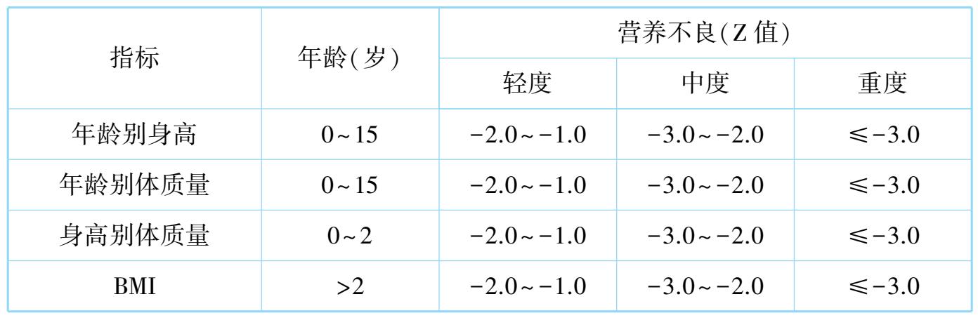 (3)体格测量及评估。体格测量指标包括身高、体质量、头围、中上臂围、肱三头肌皮褶厚度等。儿童营养不良的评价方法多采用Z值评分法,如表 1.6.1所示。或利用生长曲线图判断儿童生长是否偏离。