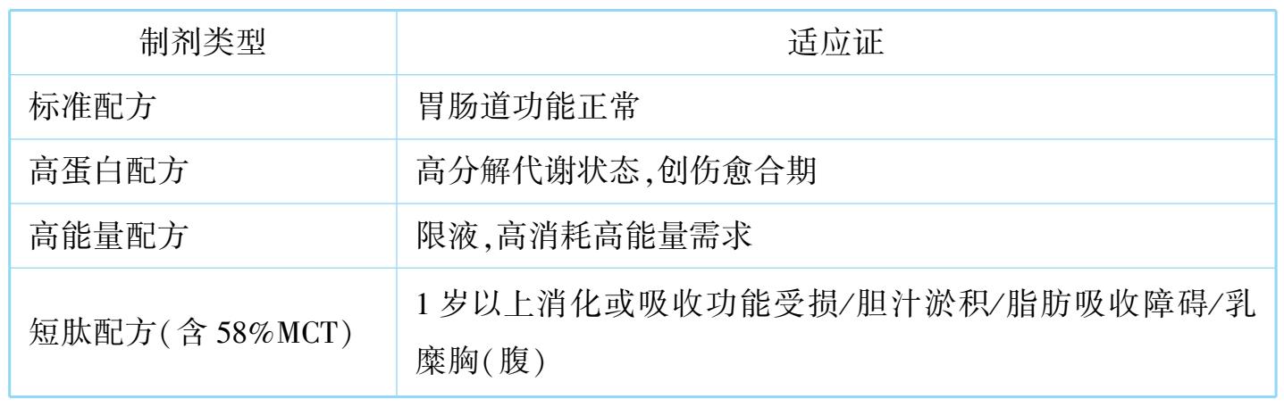 (3)肠内营养制剂。肠内营养制剂的选择取决于移植受体的营养状况、消化道功能和液体负荷能力。婴儿一般首选母乳,儿童常用肠内营养制剂及适应证如表 1.6.2 所示。