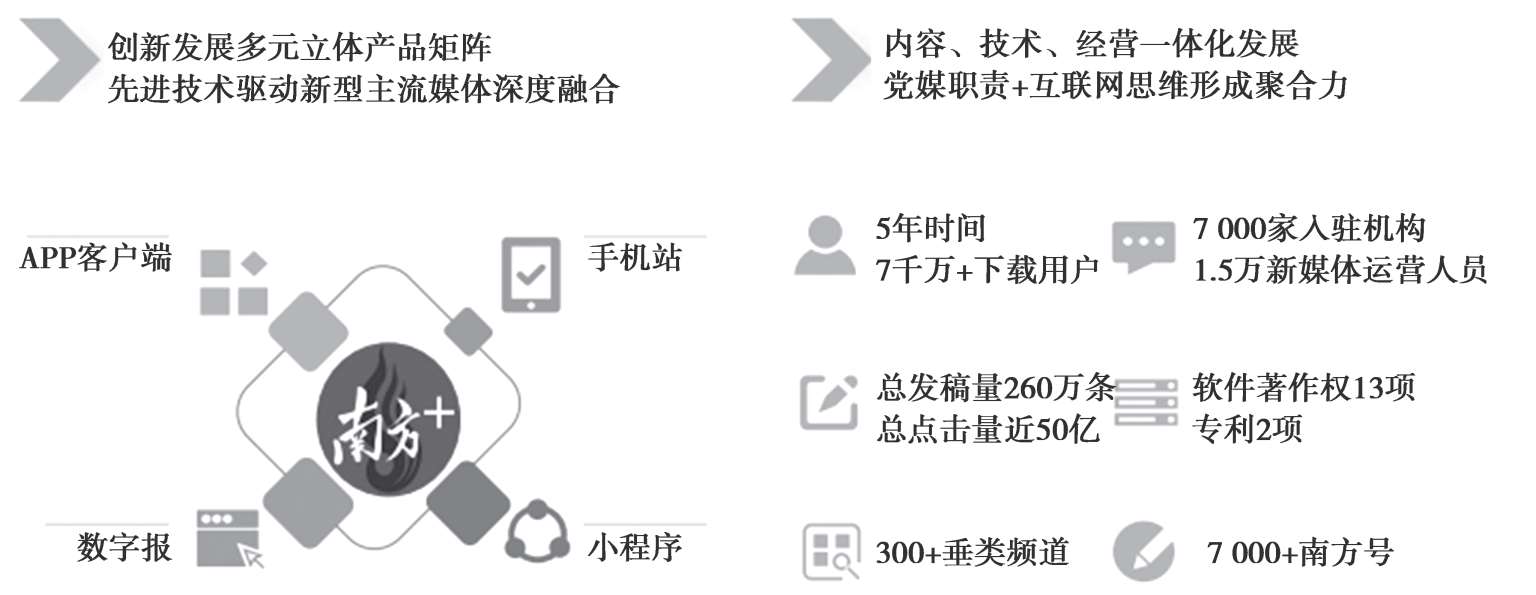 总之,“南方+”不断深化融媒一体化建设,力求全方位提升综合能力,发挥互联网赋能作用,转变过去主流媒体“传者中心”的思考逻辑,围绕用户积极发挥其党媒属性与社会服务价值,满足差异化需求。同时积极布局自身技术及产品体系搭建,形成内容生产传播平台、经营创新服务平台、运营推广管理平台三套系统的布局,自主可控、全方位支撑融合业务。此外,重点布局用户运营,一方面,积极利用南方报业多年深耕所积累的行业及用户资源,实现用户转化;另一方面,通过打造多维度互联网产品和服务矩阵,满足用户不同场景需求,优化用户使用体验,提升活跃度。从上线之初,“南方+”就被赋予了“广东省委省政府第一权威移动发布平台”的重要职责,此定位在 5 年的建设实践中不断强化。定位党端媒体,坚守主流价值,打造权威内容生产与传播平台;关注国计民生,联合各地权威媒体,发挥社会服务职能;整合南方报业旗下丰富的优质媒体内容,并采用“采编策划发动、矩阵联合供稿、‘南方+’统筹传播”的内容开放生产模式,同时调动地方行政资源,积极利用自身资源发挥政务新媒体整合力。“南方+”客户端持续响应国家媒体深度融合发展政策,通过继续深化体系改革,持续输出高质量内容,突出自身党媒属性的差异化特色,发挥党媒对于社会的服务性职能。未来将继续重点打造优质内容开放共享平台,和多主流平台合作共赢,持续提高媒体传播掌控力;深化体系改革,创新机制体系建设,优化内容生产与传播模式、拓展新品业务、持续研发信息化技术等,秉持一体化思维,不断提升自身内容、技术、服务等能力,向打造新型主流媒体的发展目标持续推进。 w3NMfFvKPJt+YrJWQLdp5NJzZ7RndGBBDjhVuexUtsrNnSG3uB84af4qj5z0SlP+