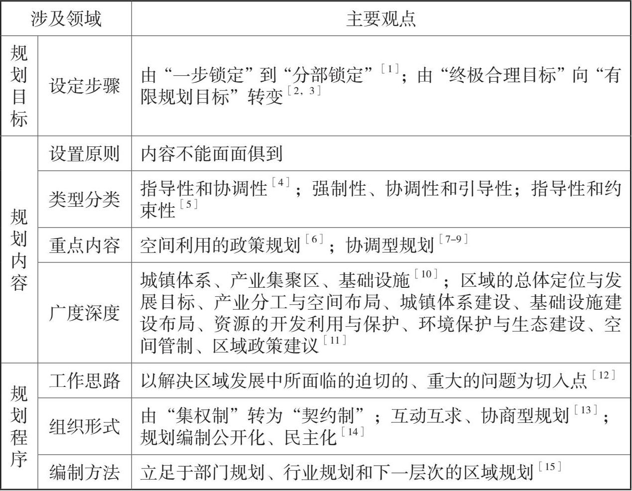 国内关于国土空间规划制度集中在城乡规划领域,研究关注重点为城乡规划目标、规划内容、规划程序和规划管理四个方面(表2.1)。