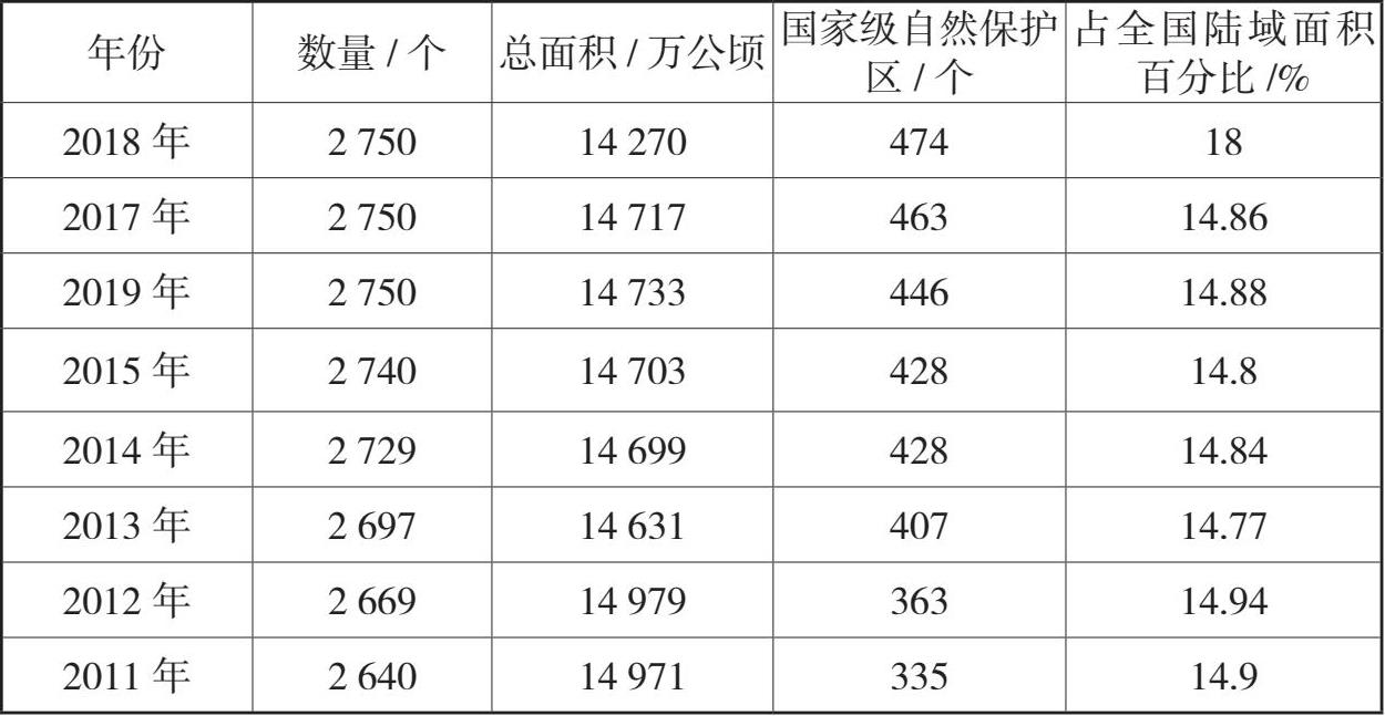 习近平总书记曾多次强调我国的生态文明建设应牢固树立“绿水青山就是金山银山”的发展理念,倡导建立人与自然和谐相处的环境友好型社会。所谓环境友好型社会,指在尊重和保护自然的思想指导下,在保障人类经济发展的同时采取有利于环境资源保护的生活和生产方式,形成和谐稳定的社会形态。我国的自然保护地建设是生态文明建设的重要举措。自我国 1956 年建立了第一个自然保护区以来,以自然保护区为主,各种类型的自然保护地开始在全国范围内逐步建立。从数量上来看,自然保护地的数量呈逐年上升的趋势,我国已建立起一个相对完备的自然保护地体系。