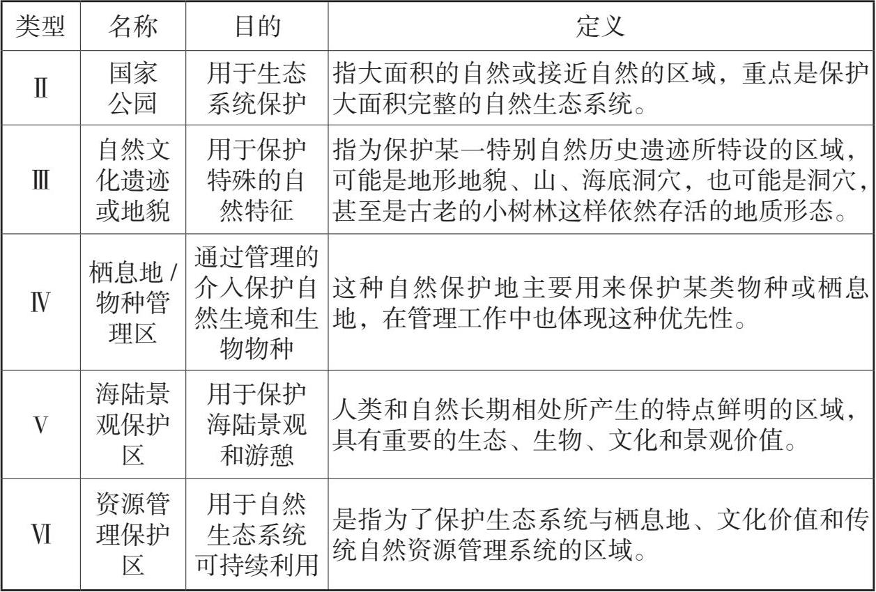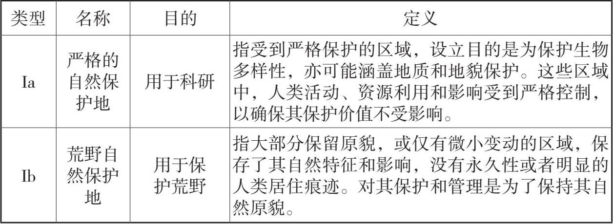 目前,世界自然保护联盟确立的自然保护地体系共包括 7 种具体类型,可按照其管制程度划分为 3 个大类:第Ⅰ—Ⅳ类为严格自然保护地,其中的Ⅰa及Ⅰb又可称为最严格的自然保护地类型;第Ⅴ、Ⅵ两个类型属于较低的严格自然保护地。