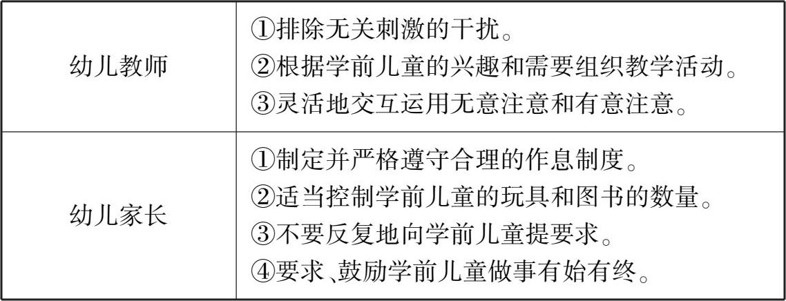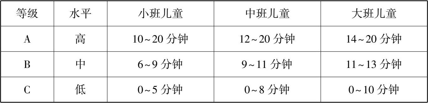 (2)注意维持的时间:在良好的教育环境下,3 岁幼儿能集中注意 3 ~ 5 分钟,4 岁幼儿能集中注意 10 分钟,5 ~ 6 岁幼儿能集中注意 15 分钟左右,如果教师组织得法,5 ~ 6 岁幼儿可以集中注意 20 分钟。