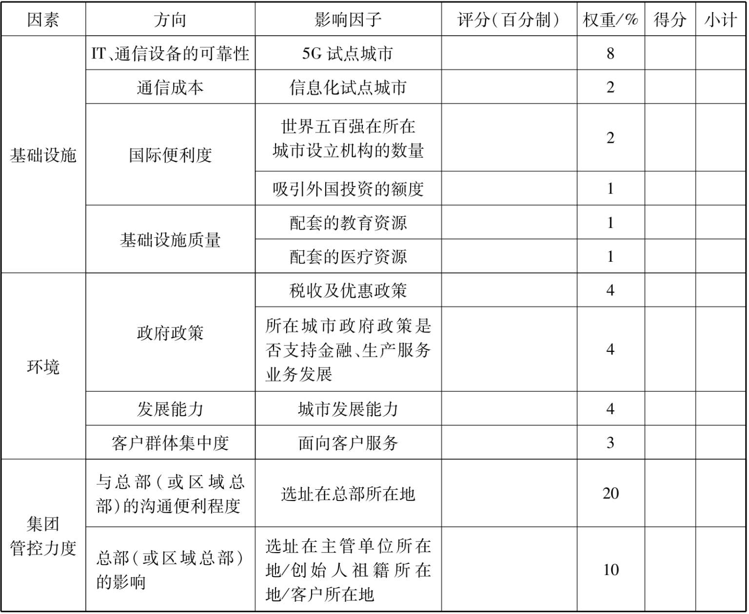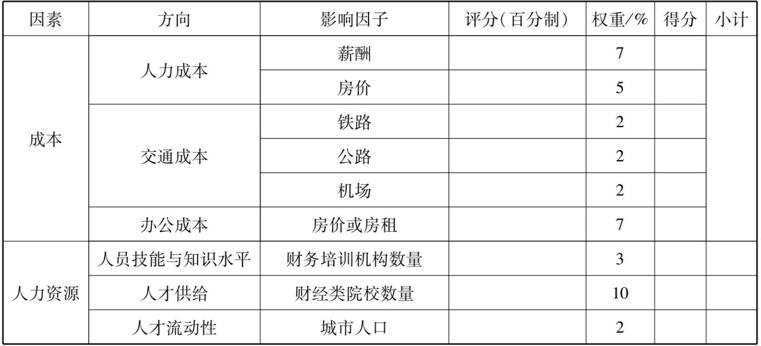 实际操作时可以先确定几个备选城市,然后按照“FSSC选址决策分析表”对每个备选城市进行数据资料收集、分项评分、加权汇总得到综合评分,以综合评分作为最终选址决策的重要依据。而因素的选取、权重的设计,均受到FSSC战略定位的重大影响。