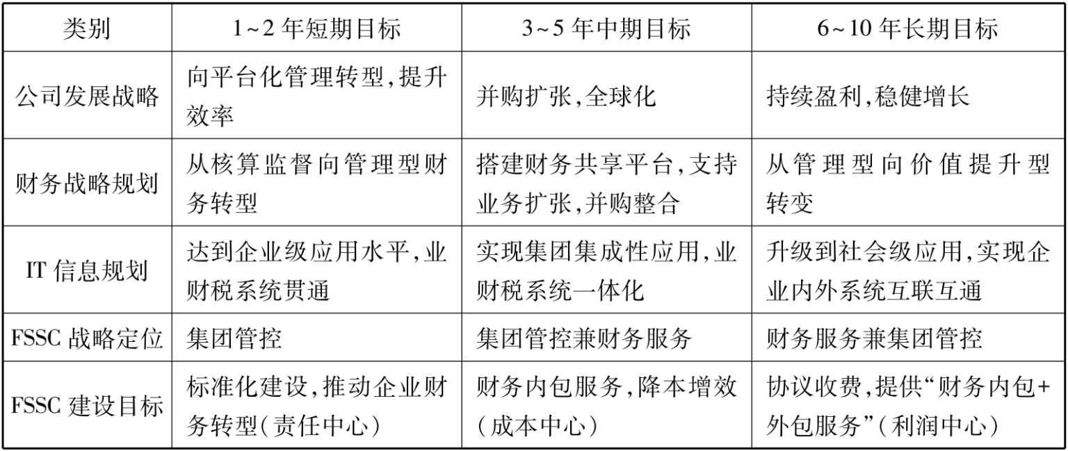 FSSC建设首先应该立足财务本身,与公司财务管理战略目标保持一致,纵向服务于公司发展战略,横向匹配公司IT信息化建设战略规划,在此基础上明确FSSC战略定位,定义FSSC建设的短期目标、中期目标和长期目标,如表 2-1 所示。