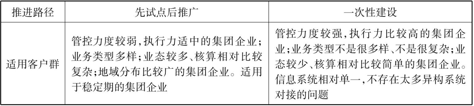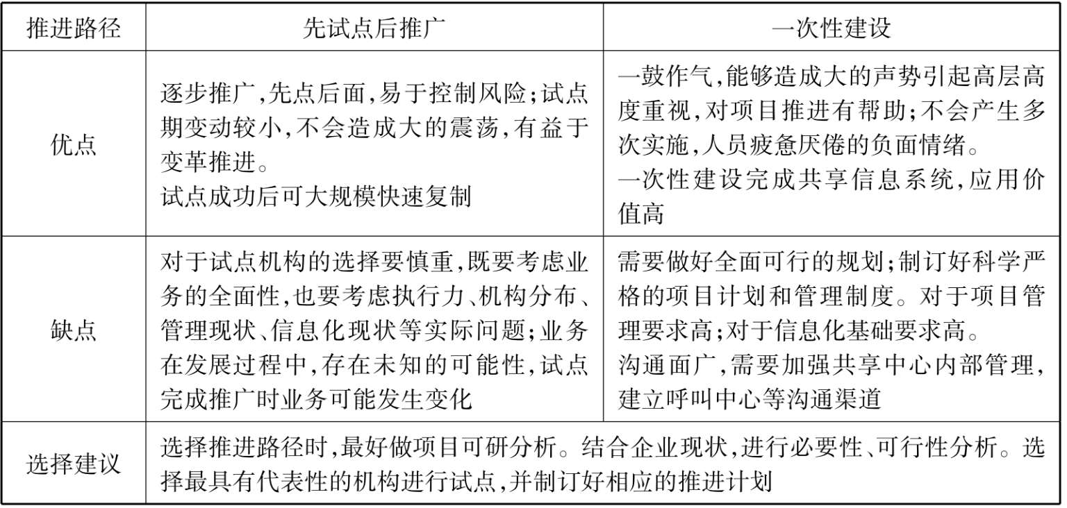 由于财务共享服务的引入是一次财务革命,因此,在建设中,不同企业会采用不同的建设路径。一般表现为两种推进路径:先试点后推广,即从单业务或单组织试点,逐步推广到全业务或全组织;一次性建设,即一次性在全业务、全组织范围建设FSSC。两种推进路径的比较以及选择建议如表 2-2 所示。