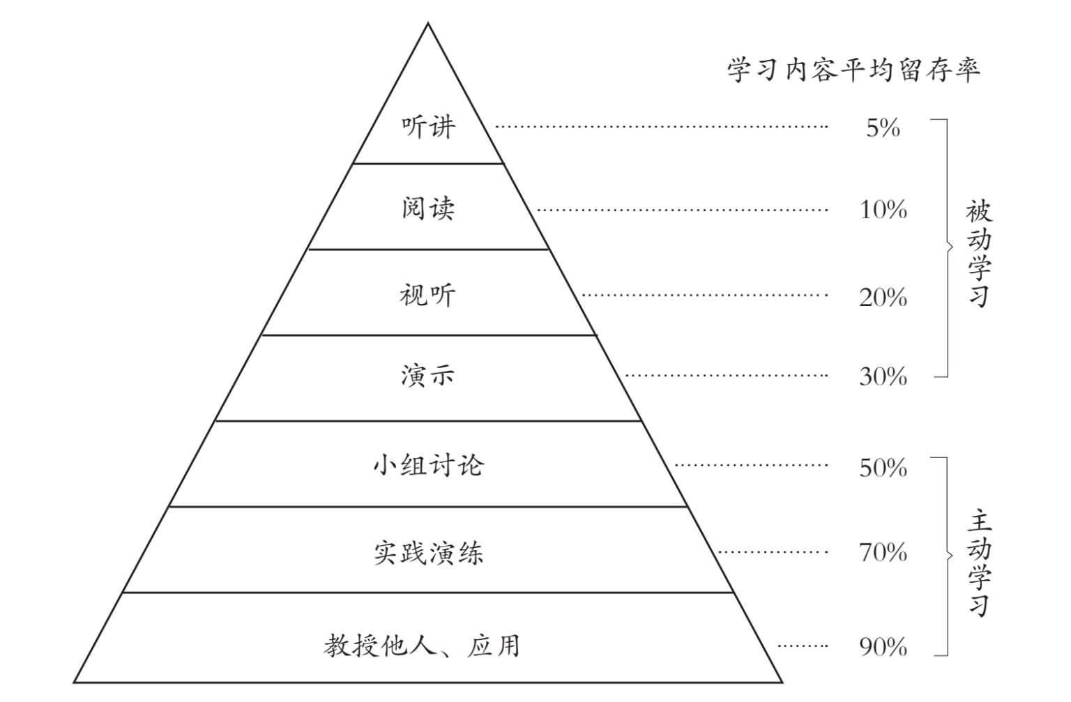 美国缅因州国家训练实验室曾做过一个实验,研究学习者采用不同的学习方法,两周后还能记住多少学习内容,由此实验而形成了著名的“学习金字塔”(图1—1)。