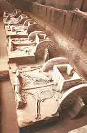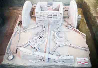 即使在车马坑中也有真人陪葬。目前殷墟已经发掘的车马坑有40多个。单单在一座小车马坑内,就埋葬了4部马车,每辆马车前的两匹驾马已变成累累白骨。而在每辆车后,都横躺着一具车夫的遗骸。车上有弓有箭、有刀有戈,数量还不少。看来贵族的车夫还兼具警卫的功能。