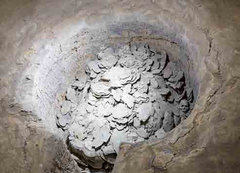 的一个穴坑里,也有一名王宫卫士的遗骸,不同的是,他面前多了一块盾牌。这名士兵的上半身笔直挺立,一副警戒的样子,嘴巴张得很大,看上去表情十分惊恐。经检查发现,他生前是被捆绑固定在立柱上,摆好姿势后,被活埋致死。其实这些小型的穴坑并非殉葬坑,而是宫殿地基中的柱础,商代统治者就是用这些士兵的尸骸来守卫王城、夯实地基的。
