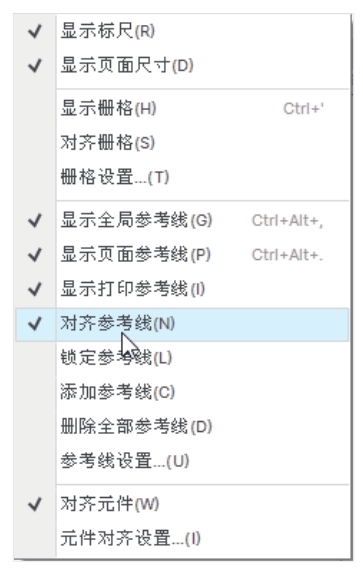 用户可以执行“视图>标尺、栅格和参考线>对齐参考线”命令或在页面中单击鼠标右键,在弹出的快捷菜单中选择“标尺、栅格和参考线>对齐参考线”命令,如图1-91所示。激活“对齐参考线”命令后,移动对象时会自动对齐参考线。