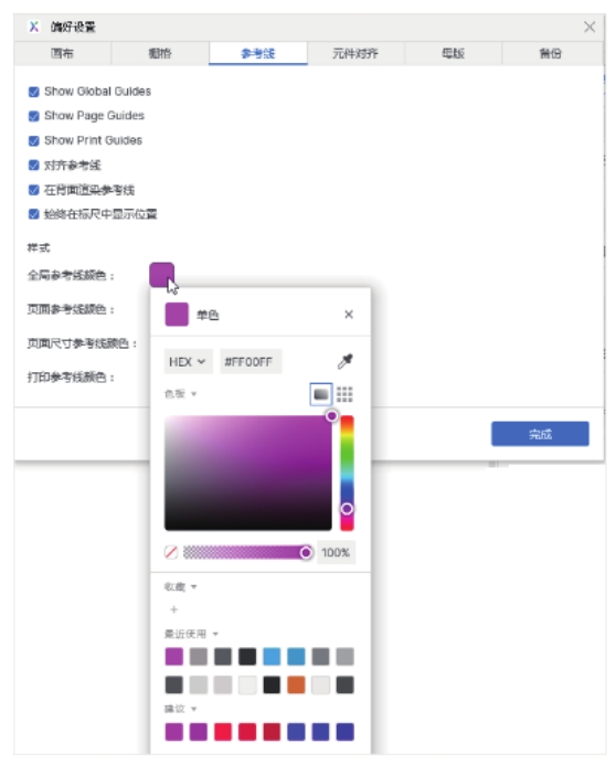 为了防止用户混淆多种参考线,Axure RP 10允许用户为不同种类的参考线指定不同的颜色;用户可以根据需求在“样式”选项下分别设置4种参考线的颜色。单击色块,在打开的拾色器面板中选择颜色,即可完成参考线颜色的修改,如图1-103所示。
