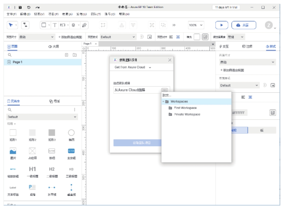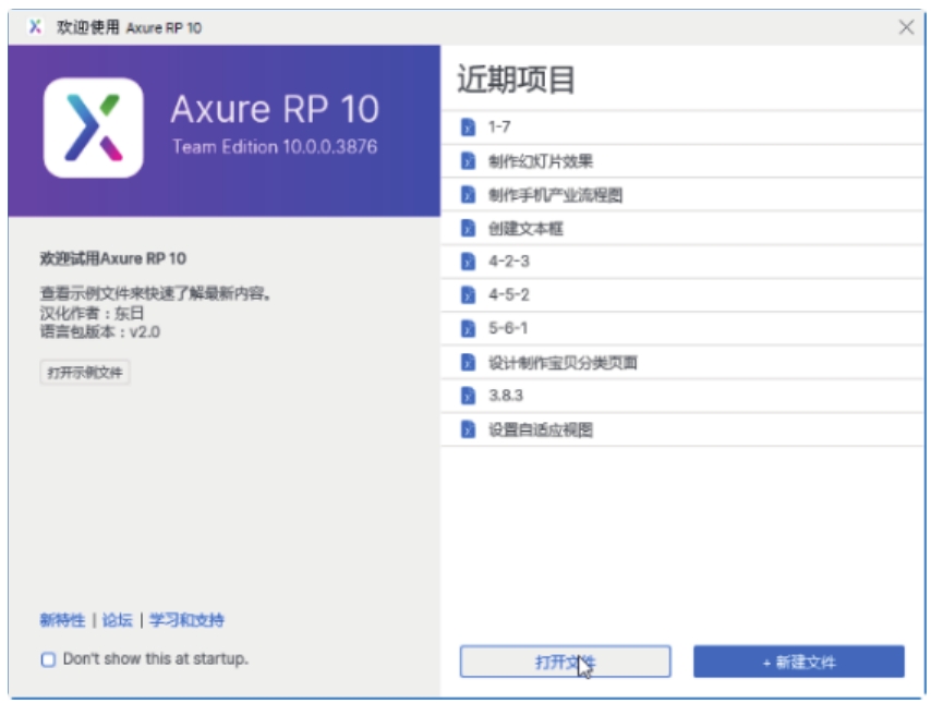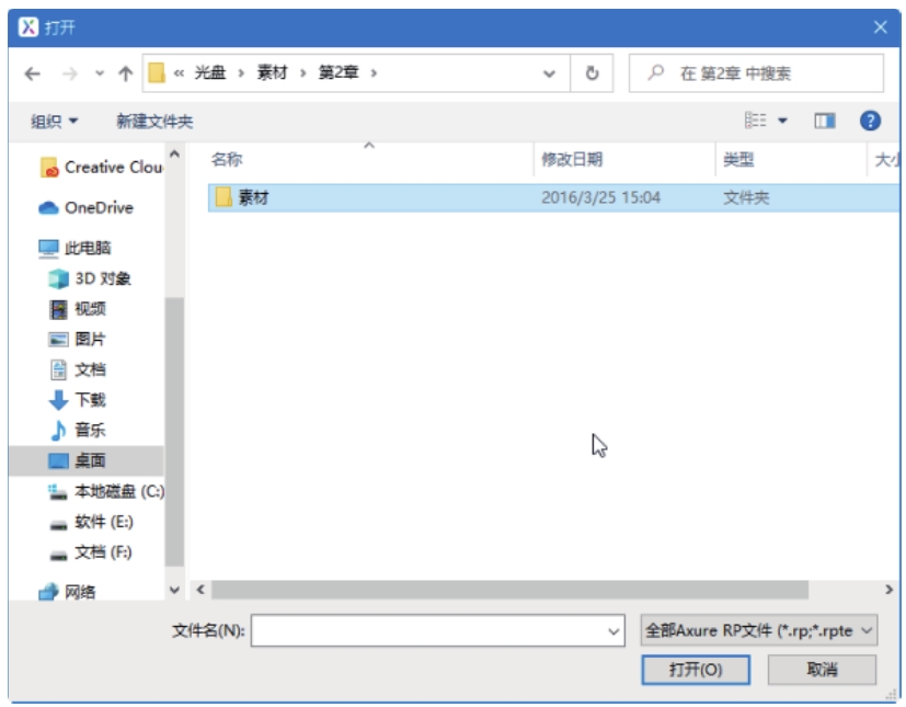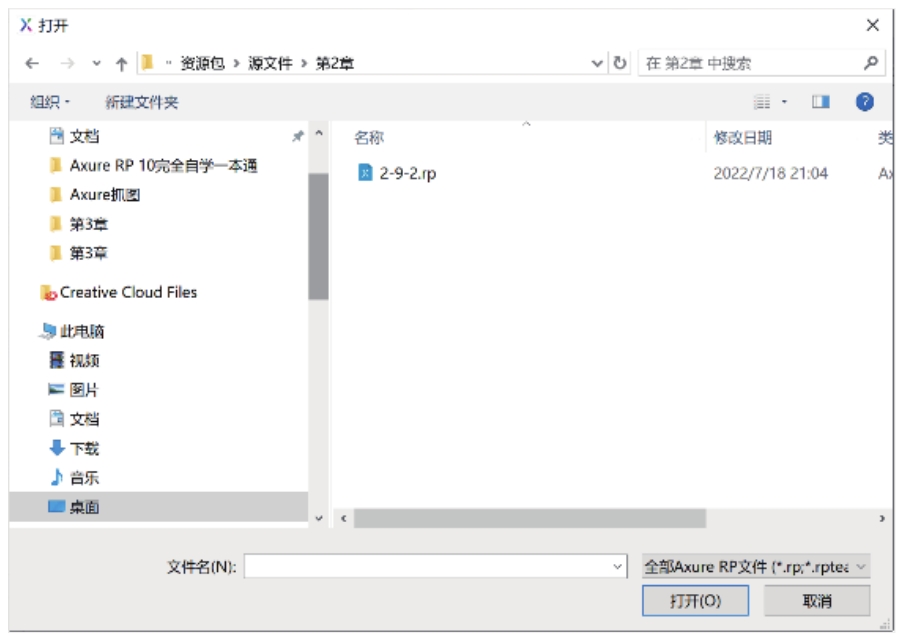 启动Axure RP 10时,会自动弹出“欢迎使用Axure RP 10”对话框,单击该对话框右下角的“打开文件”按钮,如图2-19所示。弹出“打开”对话框,选择“.rp”格式的文件,单击“打开”按钮,如图2-20所示,即可将选中的文件在Axure RP 10中打开。