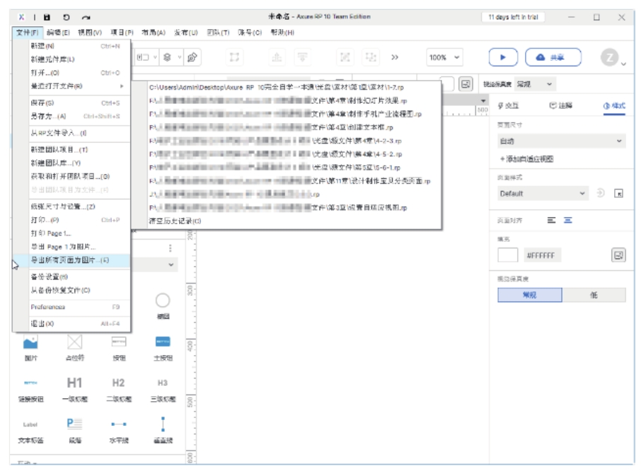 用户通常会编辑多个文件,为了方便快速查找最近使用的文件,Axure RP 10为用户保留了最近打开的10个文件。执行“文件>最近打开文件”命令,可以在打开的子菜单中选择需要打开的文件,如图2-21所示。