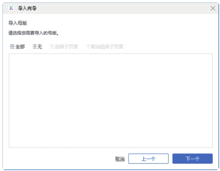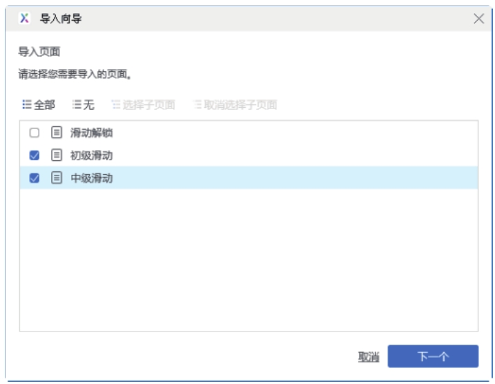 在弹出的“导入向导”对话框中选择要导入的页面,如图2-25所示。单击“下一个”按钮,选择导入母版,如图2-26所示。