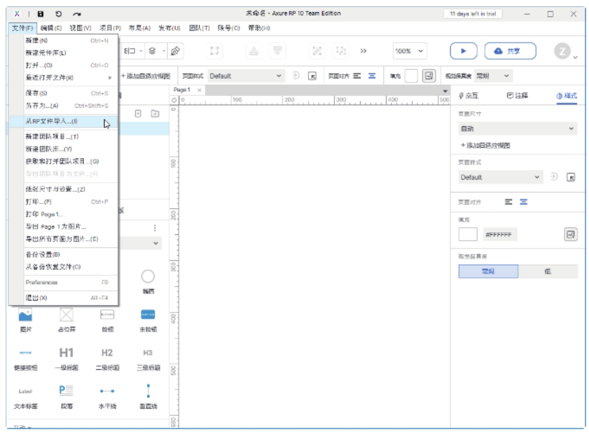 执行“文件>从RP文件导入”命令,可以将RP文件中的页面、母版、视图设置、生成设置、页面说明字段、元件字段与设置、页面样式、元件样式和变量等内容直接导入到新建文件中,供用户再次使用。