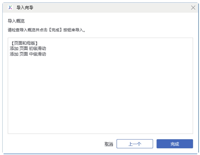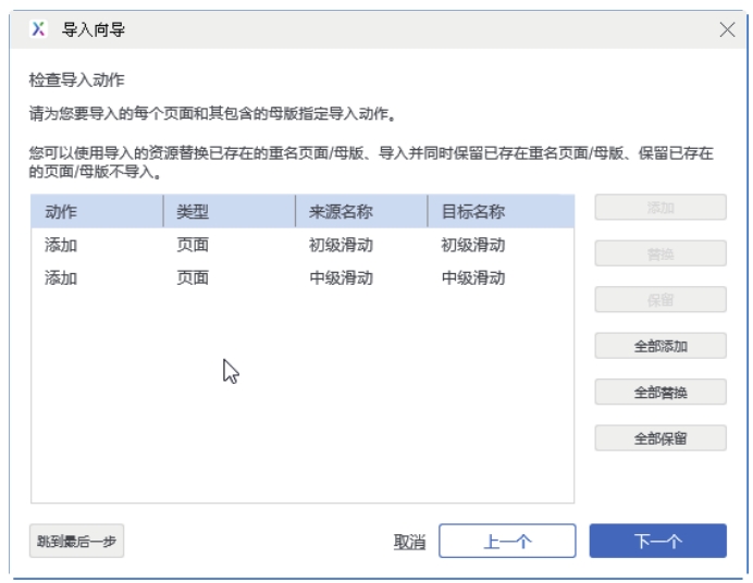 单击“下一个”按钮,检查导入动作,选择替换目标页面或母版,如图2-27所示。由于该页面没有其他内容需要导入了,单击“跳到最后一步”按钮,进入导入概览页面,单击“完成”按钮,完成导入,如图2-28所示。