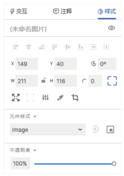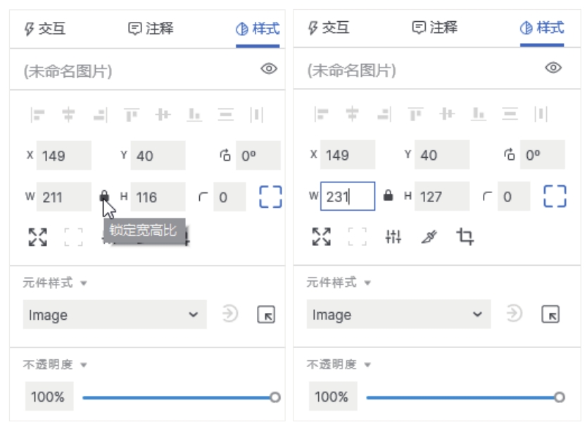 用户也可以在“样式”面板中输入元件的准确坐标和尺寸,如图2-34所示。通过单击“锁定宽高比”按钮,可以保证在输入一个数值时,另一个数值自动等比例变化,如图2-35所示。