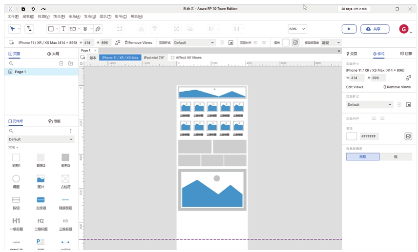 单击工作区顶部的“iPhone 11/XR/XS Max(414×896)”选项卡,页面效果如图3-77所示。取消选择“Affect All Views(影响所有视图)”复选框,调整元件的大小和分布,页面效果如图3-78所示。
