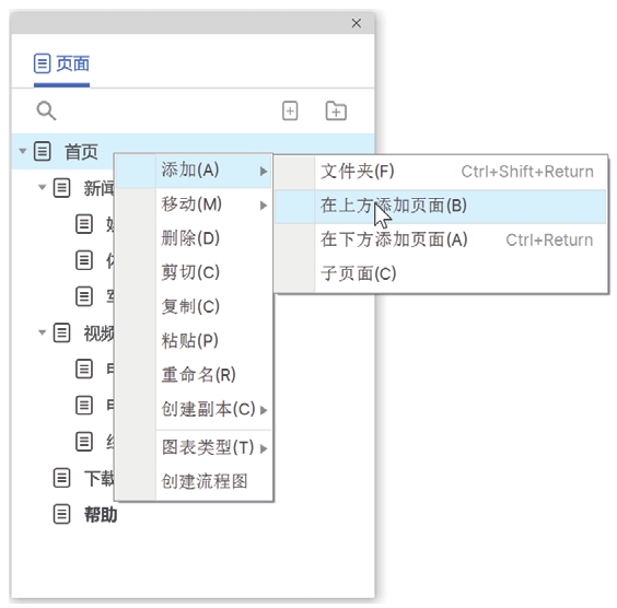 新建一个文件并完成原型页面的创建,选择“首页”页面,单击鼠标右键,在弹出的快捷菜单中选择“添加>在上方添加页面”命令,如图3-86所示,在“首页”上方新建一个页面。