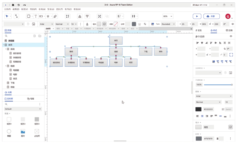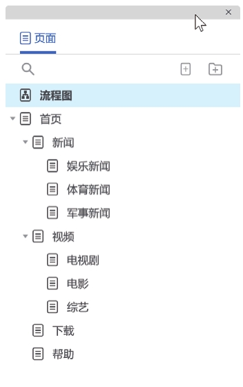 用户完成产品原型的制作后,可以在“页面”面板中查看产品原型设计的页面结构,并将页面结构创建为流程图,方便设计师和项目团队中的人员对上层领导或客户进行简单的讲解说明与展示。